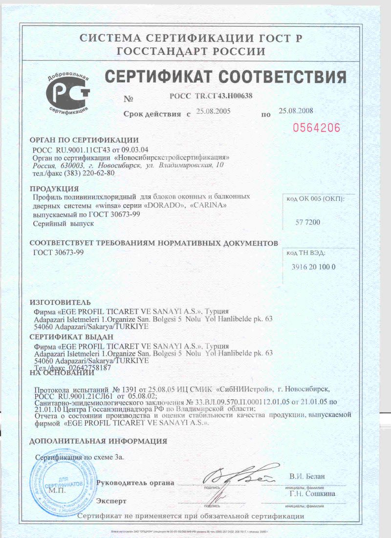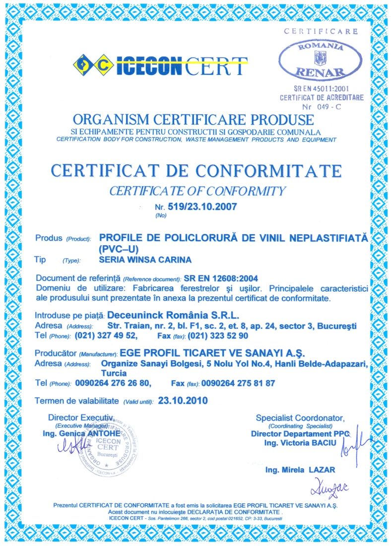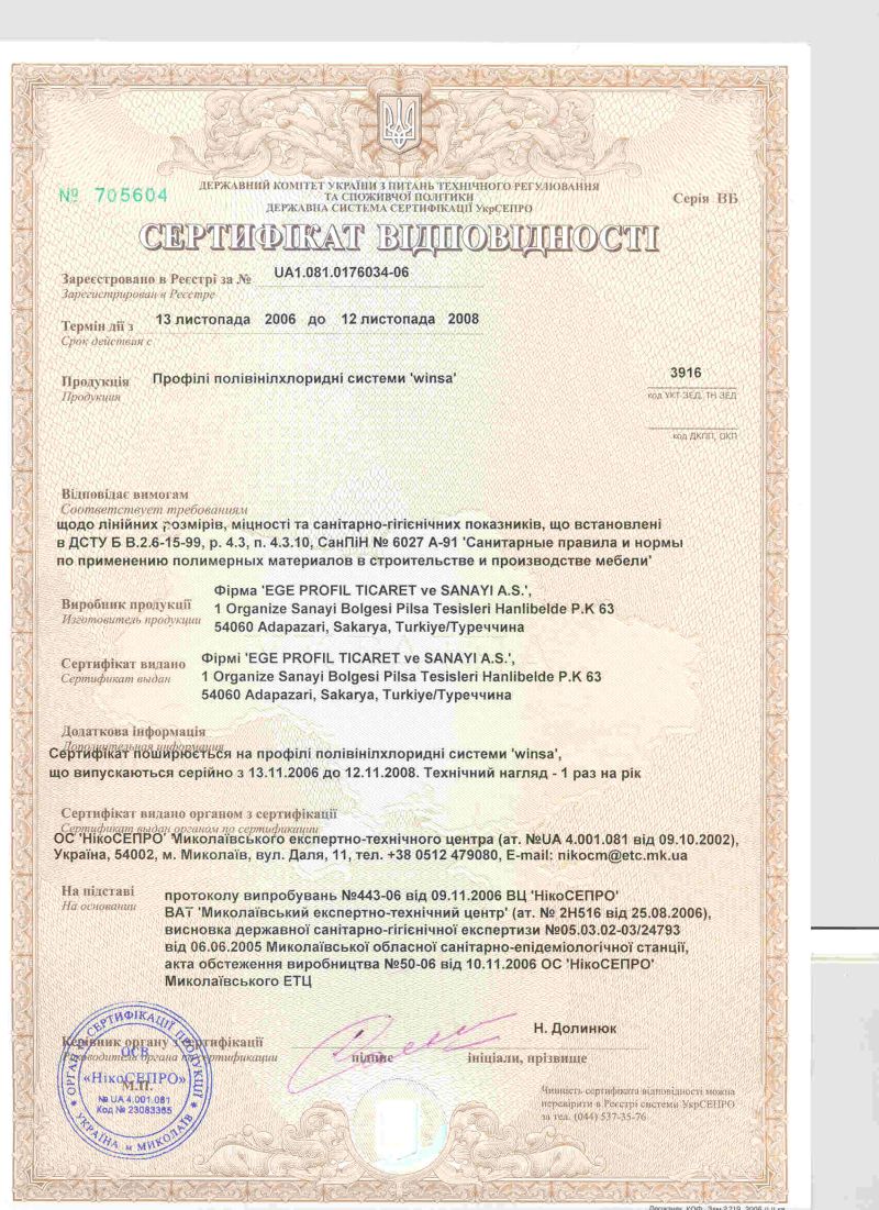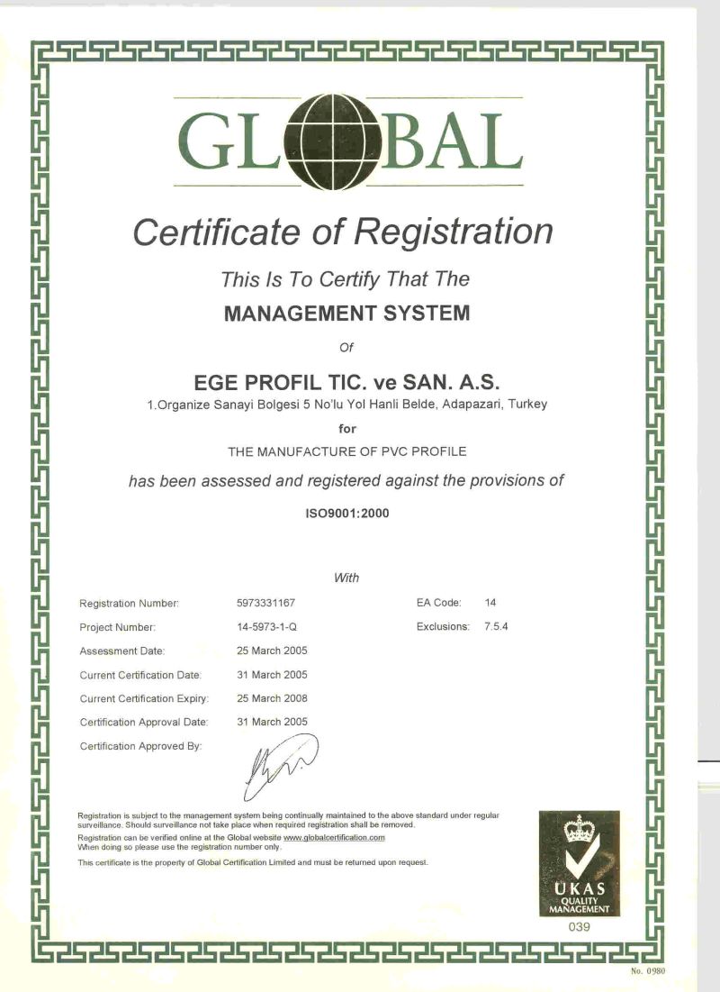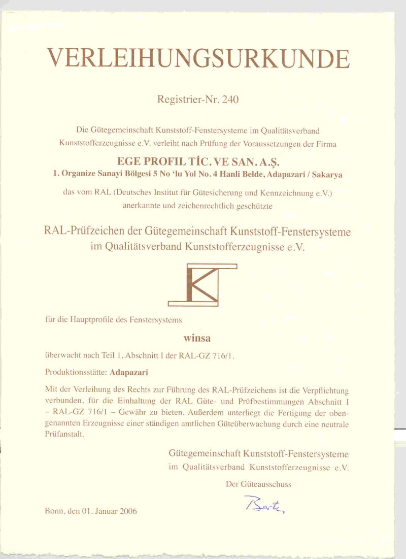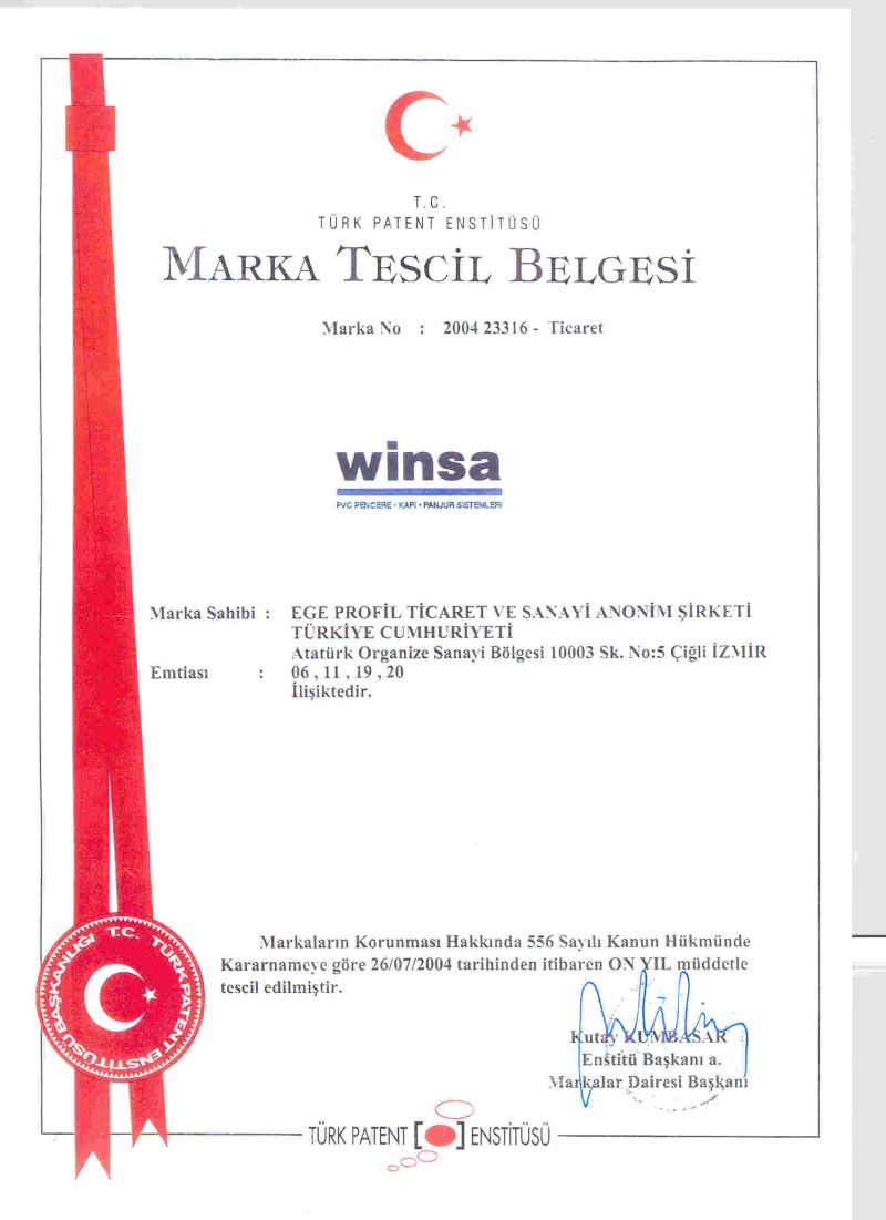 TS 18001 İŞ SAĞLIĞI VE GÜVENLİĞİ YÖNETİM SİSTEMİ - TS EN ISO 14001 ÇEVRE YÖNETİM SİSTEMİ - TSE 5358 EN 12608 - TS EN ISO 9001 KALİTE YÖNETİM SİSTEMİ - WINSA DORADO RAL KALİTE BELGESİ - WINSA MARKA TESCİL BELGESİ - Romanya Kalite Belgesi - Gost-R Belgesi - Hoppe - Pükad Kalite Sertifikasi - 9001 Aubi - 14001 Aubi